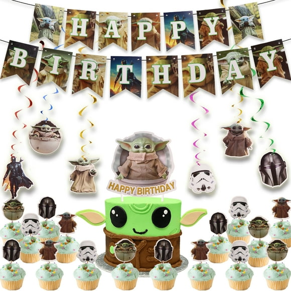 Amazon Com Gepulin 106pcs Baby Yoda Birthday Decorations Party Supplies Included Stickers Birthday Banner Hanging Swirl Balloons Cupcake Toppers Gift Bag For The Child Mandalorian Party Favors Toys Games
